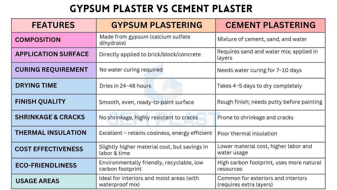 This is a clear comparison of Gypsum Plastering vs Cement Plastering to show their differences in terms of performance, efficiency and sustainability:
